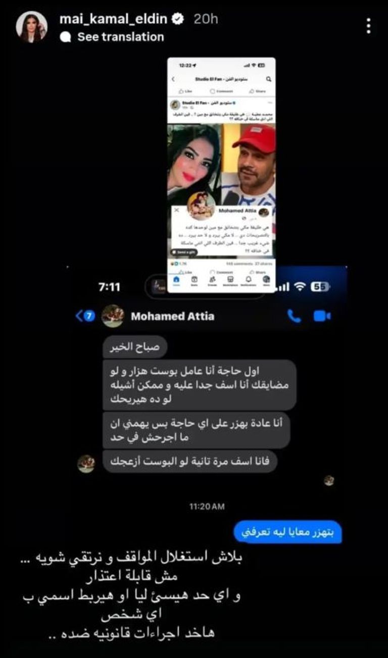 وبعد موجة الانتقادات، عاد عطية سريعاً ليعتذر مؤكداً أن ما كتبه كان بدافع المزاح وأنه لم يقصد الإساءة، لكن مي كمال الدين رفضت الاعتذار، وردت بحدة عبر حسابها: “هل تعرفني لتمزح معي؟ أنا لا أقبل هذا الاعتذار، وأي إساءة لي أو ربط لاسمي بآخر ستواجه بإجراءات قانونية”.
