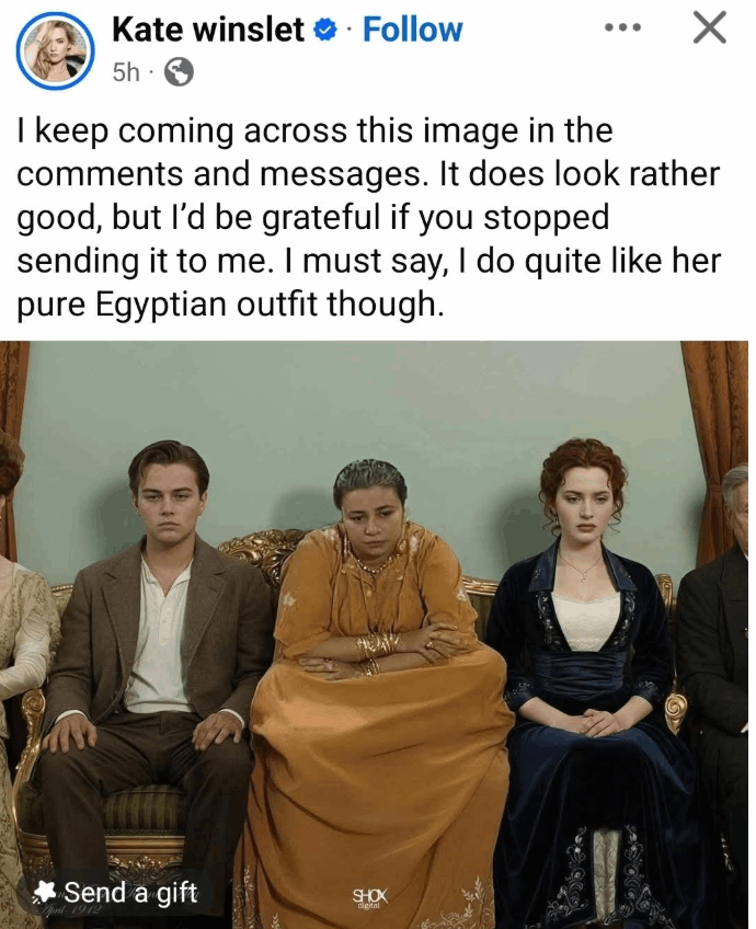 المفاجأة جاءت حين تفاعلت كيت وينسليت نفسها مع الأمر عبر حسابها الرسمي في “فيسبوك”، حيث نشرت الصورة وأبدت استغرابها من تكرار إرسالها إليها في التعليقات على منشوراتها. وكتبت النجمة البريطانية: “أصادف دائماً هذه الصورة في الرسائل، تبدو مضحكة وجيدة نوعاً ما، لكن أرجو منكم التوقف عن إرسالها، ومع ذلك أعجبتني ملابسها المصرية”.