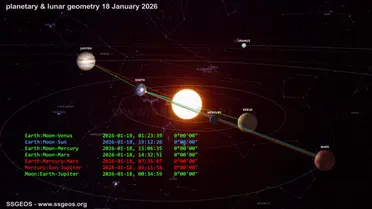 نشر راصد الزلازل الهولندي فرانك هوغربيتس، مساء أمس السبت، صورة تظهر اصطفاف عدد من الكواكب، بينها الزهرة وعطارد والمريخ والمشتري، واقترانها مع الأرض والشمس والقمر، مشيراً إلى أن تلك هي هندسة الكواكب التي يشهدها الفضاء اليوم الأحد 18 كانون الثاني. كما توقع في تدوينة أخرى على قنواته بمواقع التواصل، بحدوث زلزال بقوة 8 على مقياس ريختر، محدداً بلداً بعينه.